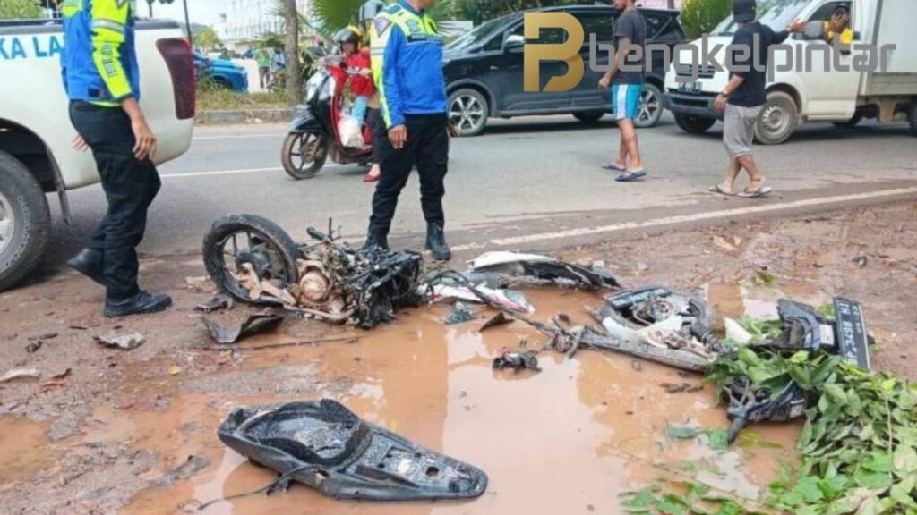 Kerusakan tidak hanya dialami sepeda motor, tetapi juga mobil Toyota yang terlibat. Benturan dengan trotoar membuat bagian depan kendaraan ringsek. Puing-puing kendaraan terlihat berserakan di sekitar lampu merah, menandakan kuatnya benturan yang terjadi.